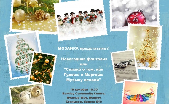 Культурно-образовательный центр Мозаика приглашает детей и взрослых на Новогоднее представление с песнями, танцами, встречей с Музыкой, Дедом Морозом и Снегурочкой! Утренник состоится 19 декабря в 10.30 по адресу: Bentley Community Centre. Наличие мест ограничено, вход по заранее купленным билетам. БИЛЕТЫ НА ВХОДЕ ПРОДАВАТЬСЯ НЕ БУДУТ! Стоимость одного билета для взрослых и детей старше 2-х лет