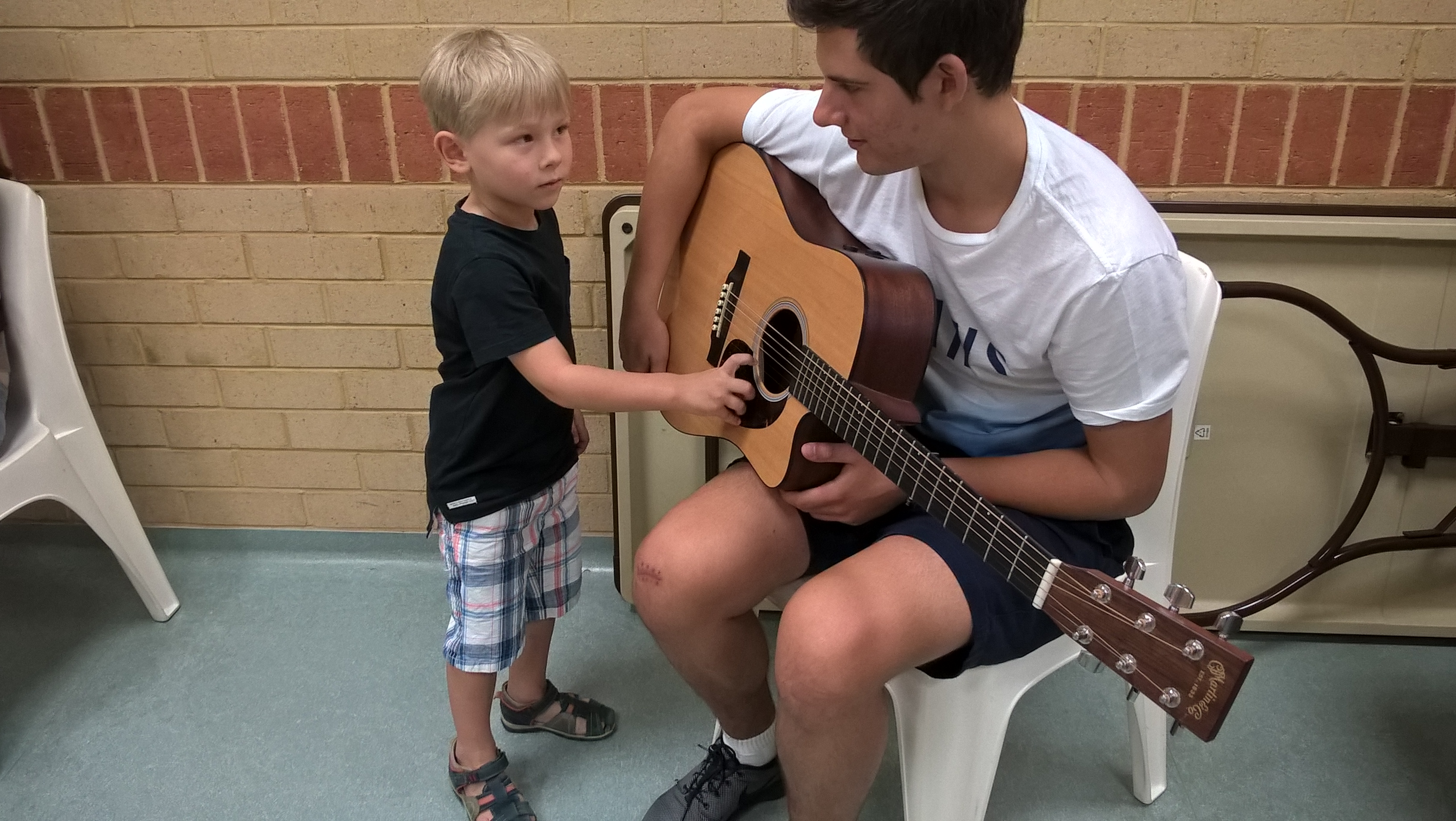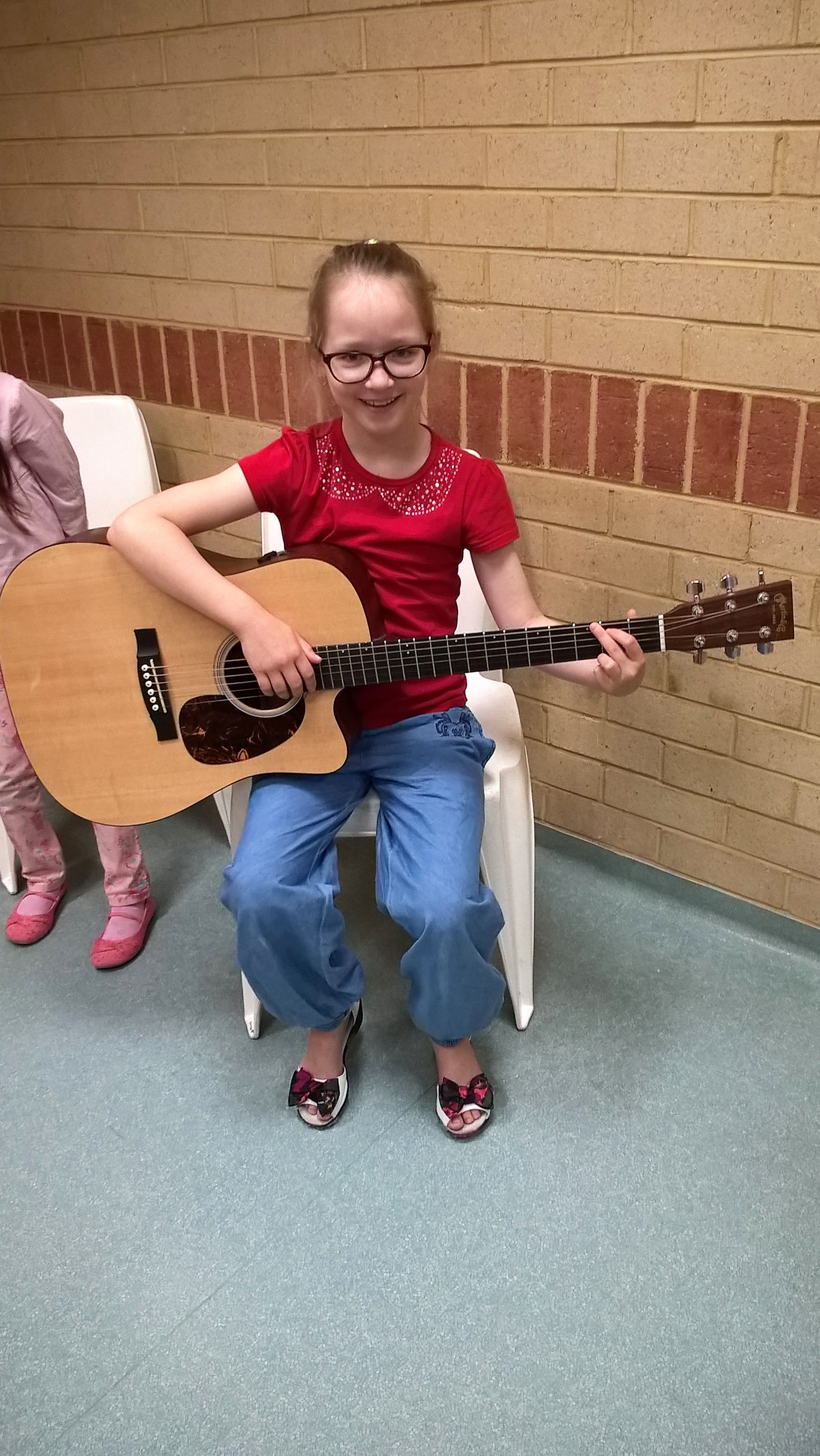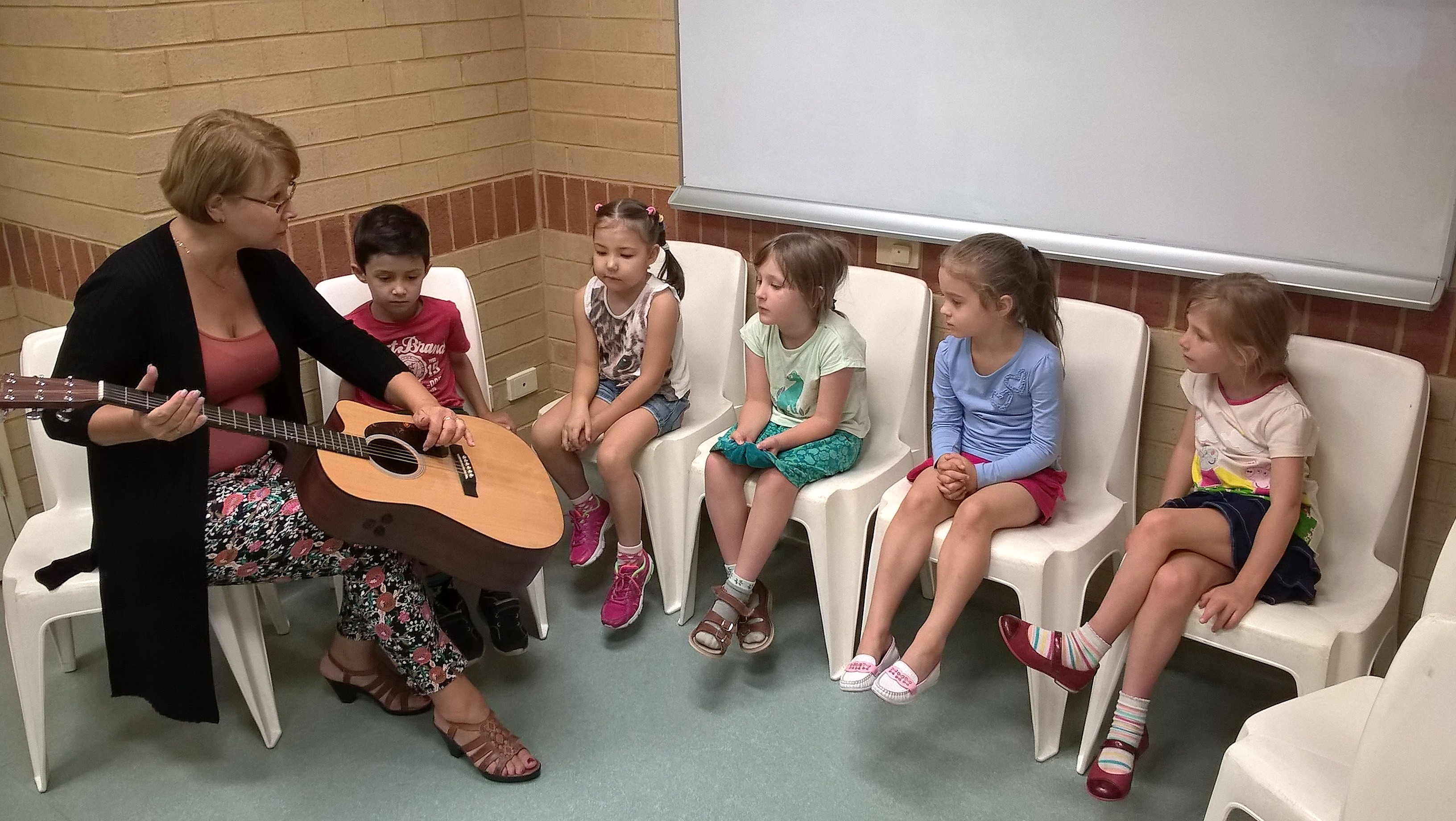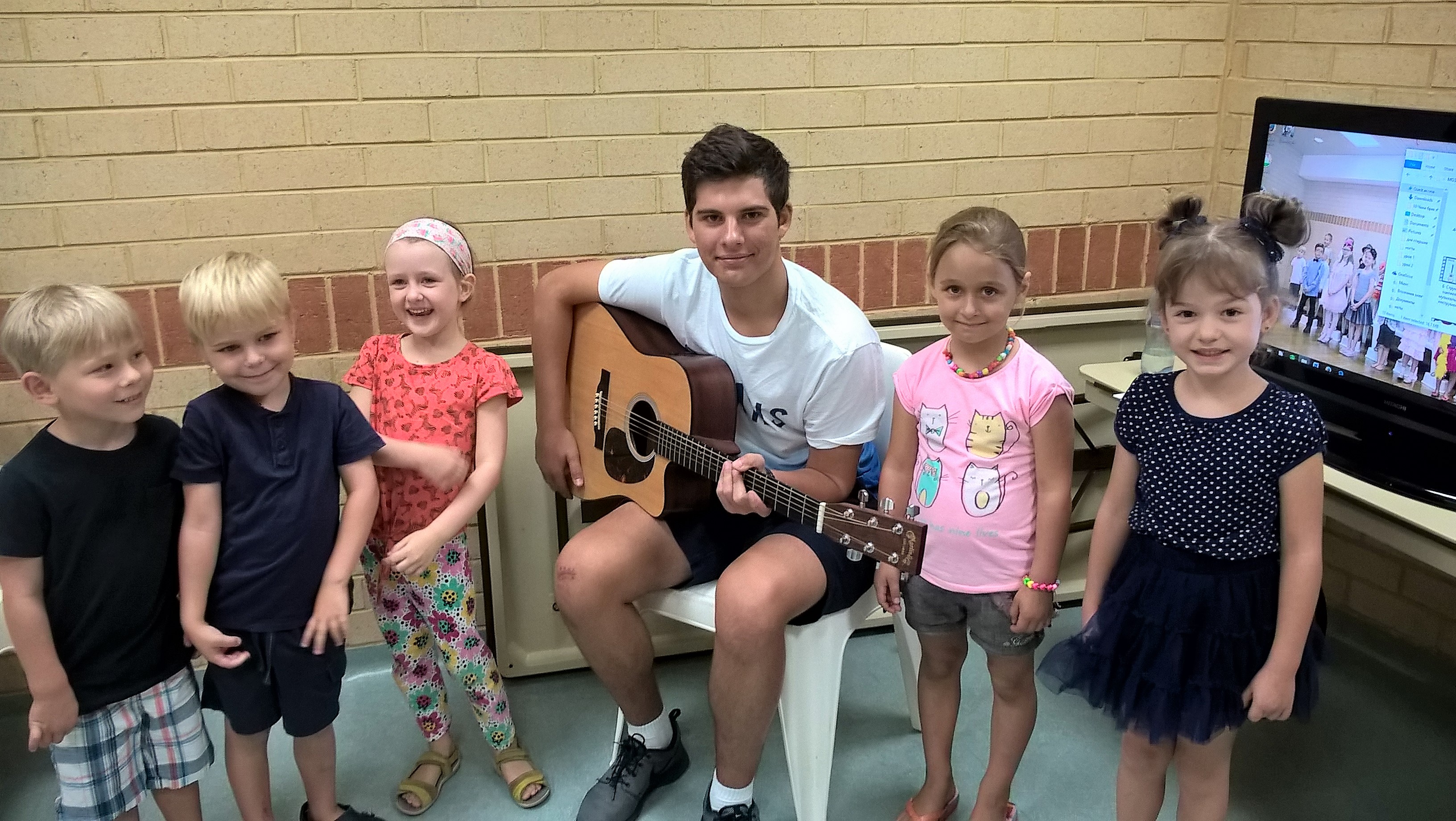 На наши уроки пришел ученик нашей школы Жученко Федя, который учится играть на гитаре. Ребята увидели в классе, что на гитаре играют пальцами, но можно и медиатором. Они смогли подержать гитару в руках и попробовали извлекать из нее звуки. Федя поиграл ребятам небольшие пьесы, а потом мы все вместе попели детские песенки под гитарный аккомпанемент.
