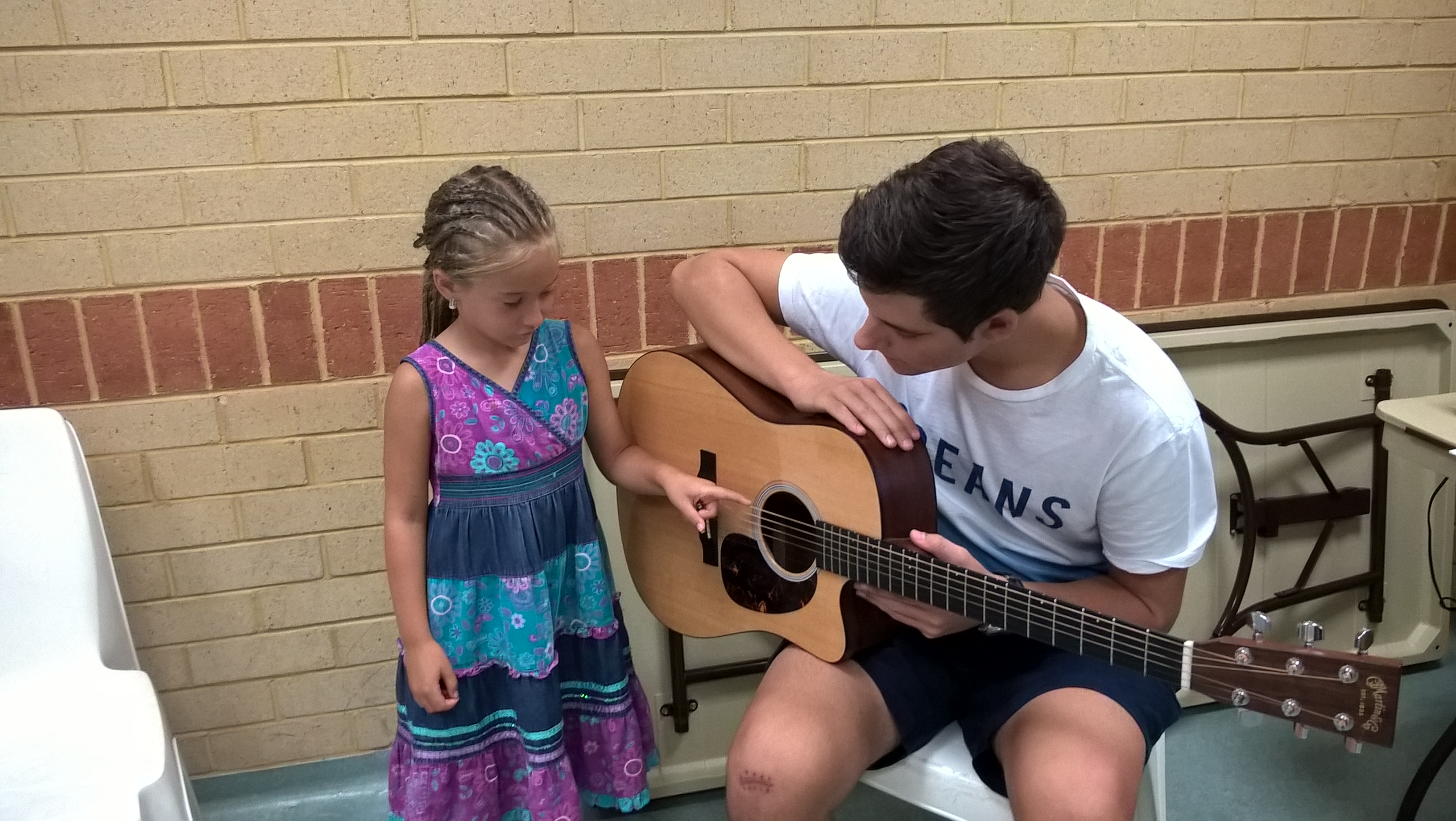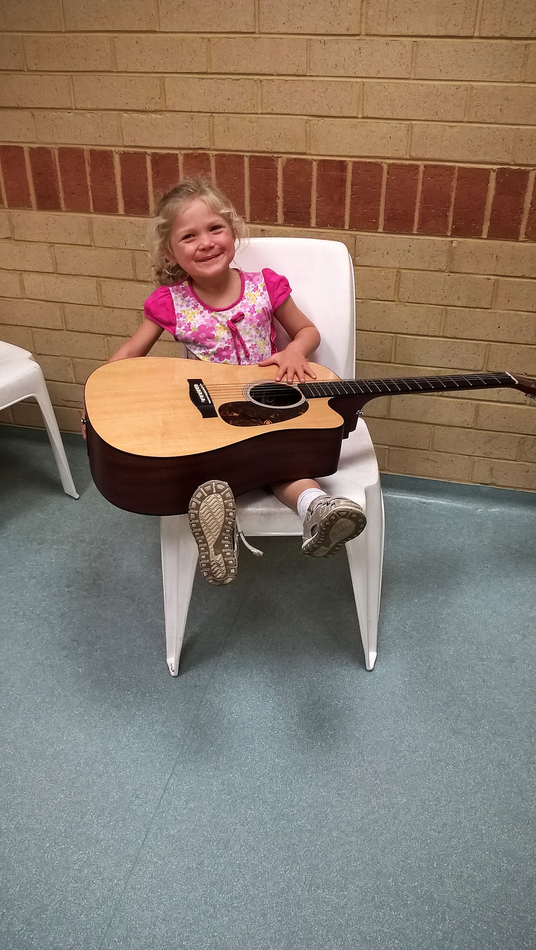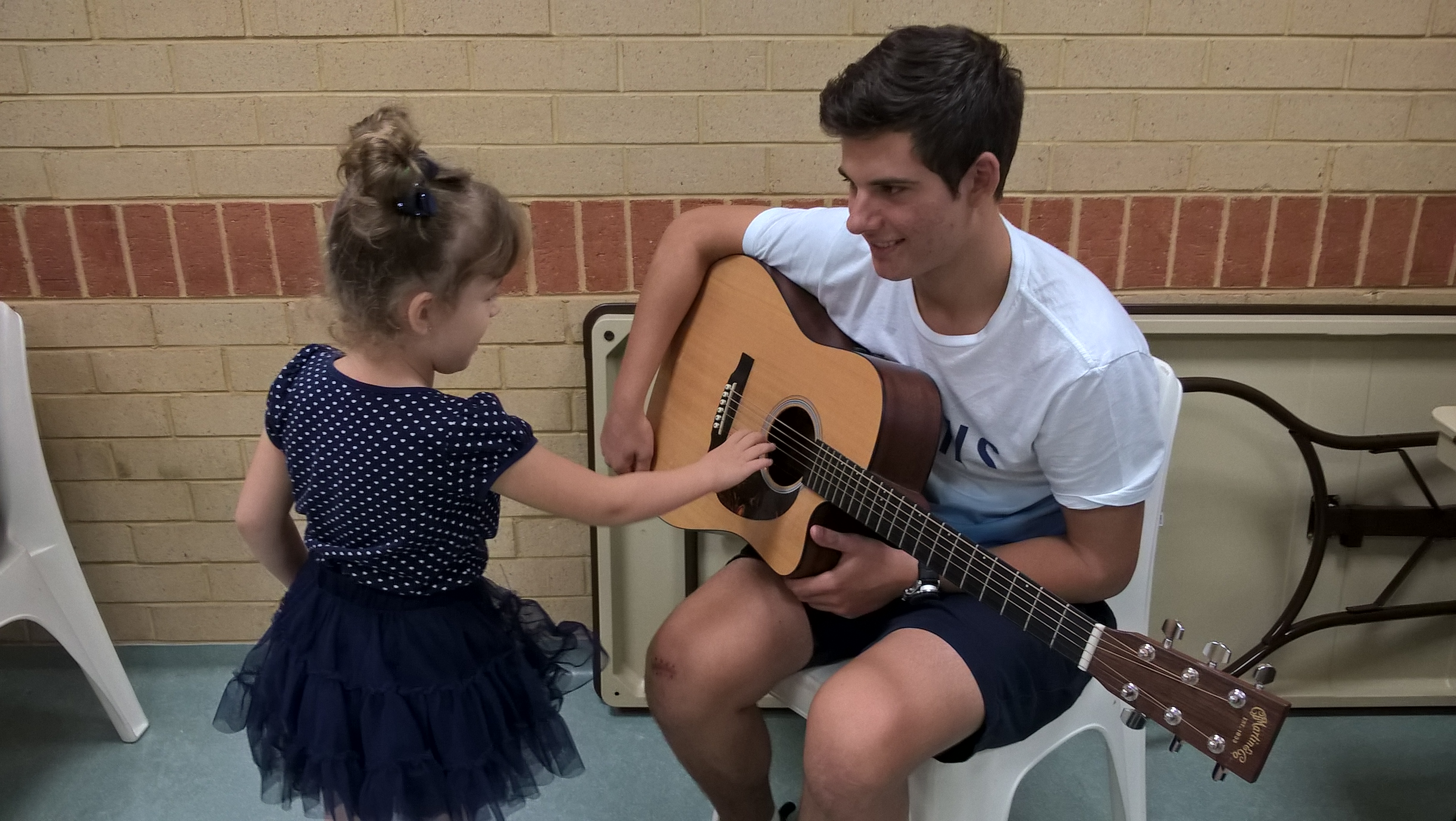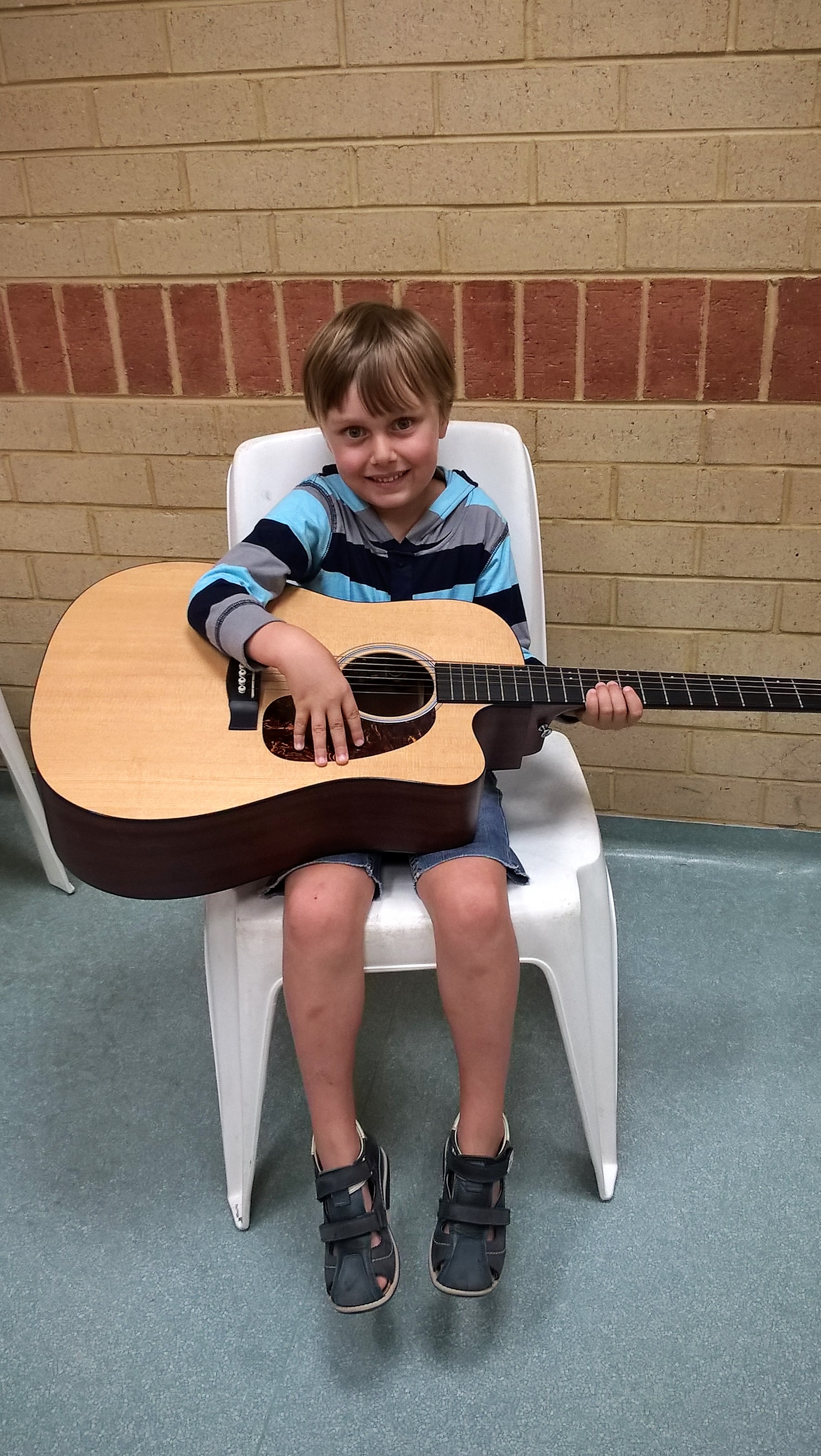 На наши уроки пришел ученик нашей школы Жученко Федя, который учится играть на гитаре. Ребята увидели в классе, что на гитаре играют пальцами, но можно и медиатором. Они смогли подержать гитару в руках и попробовали извлекать из нее звуки. Федя поиграл ребятам небольшие пьесы, а потом мы все вместе попели детские песенки под гитарный аккомпанемент.