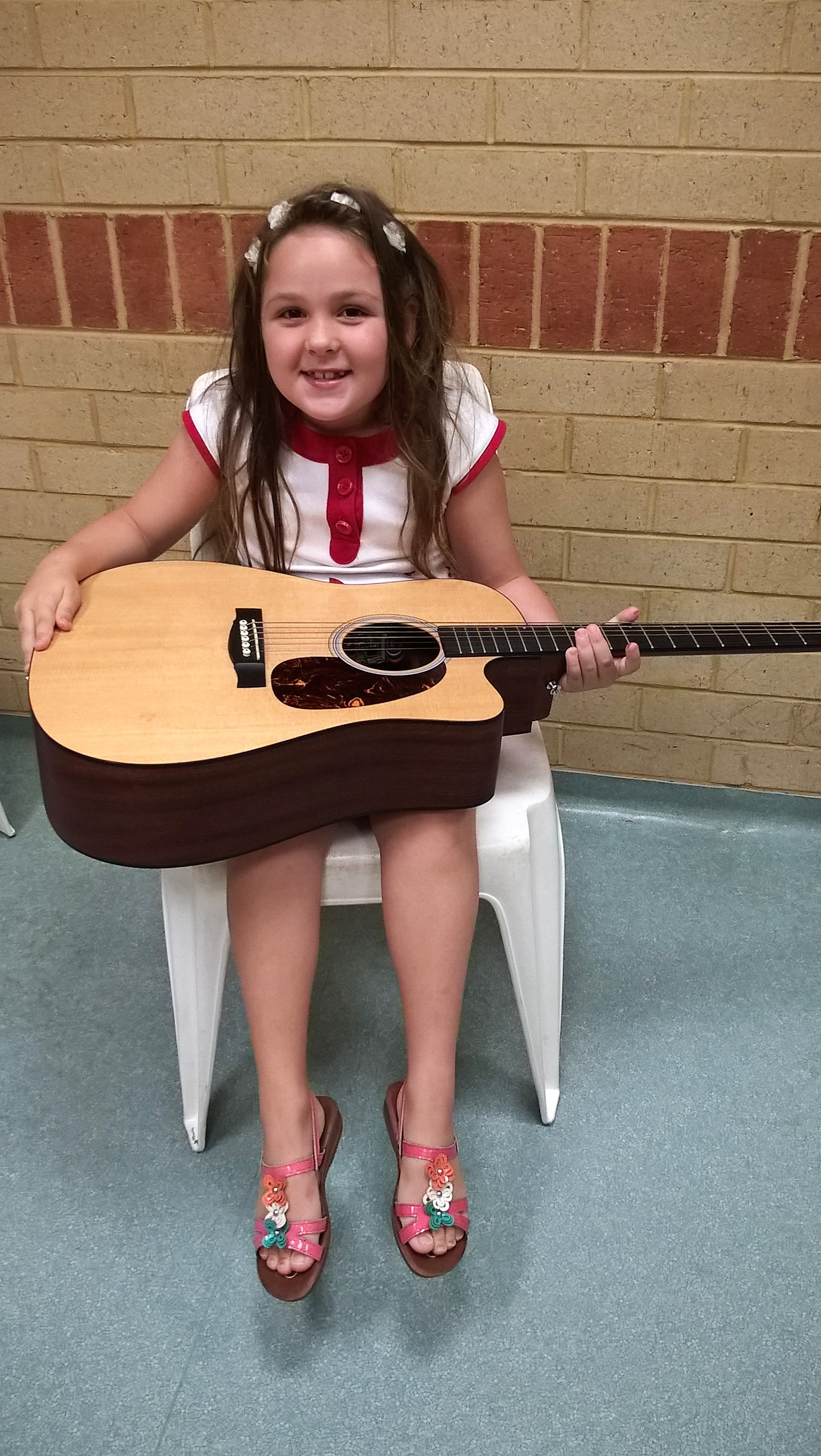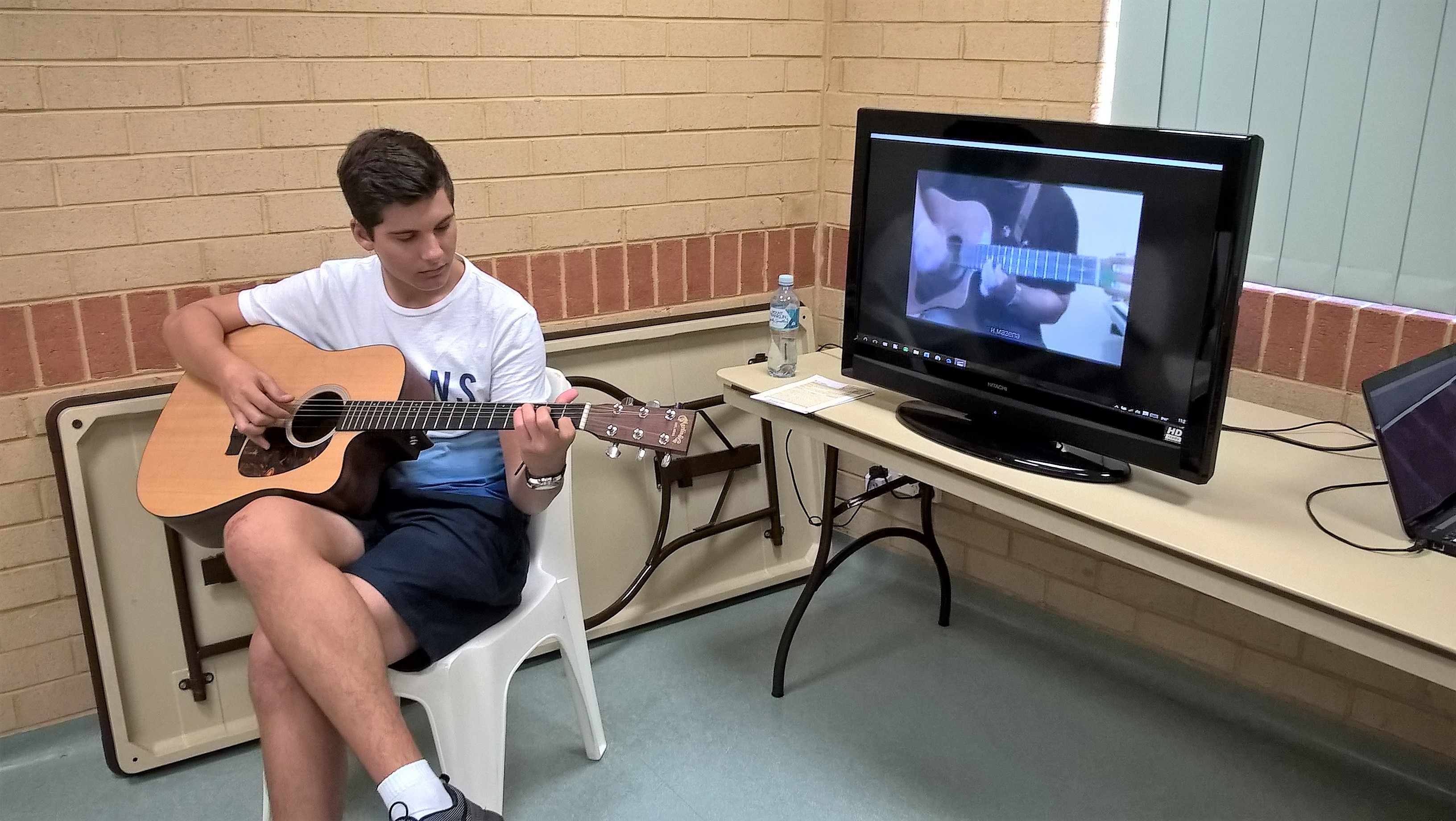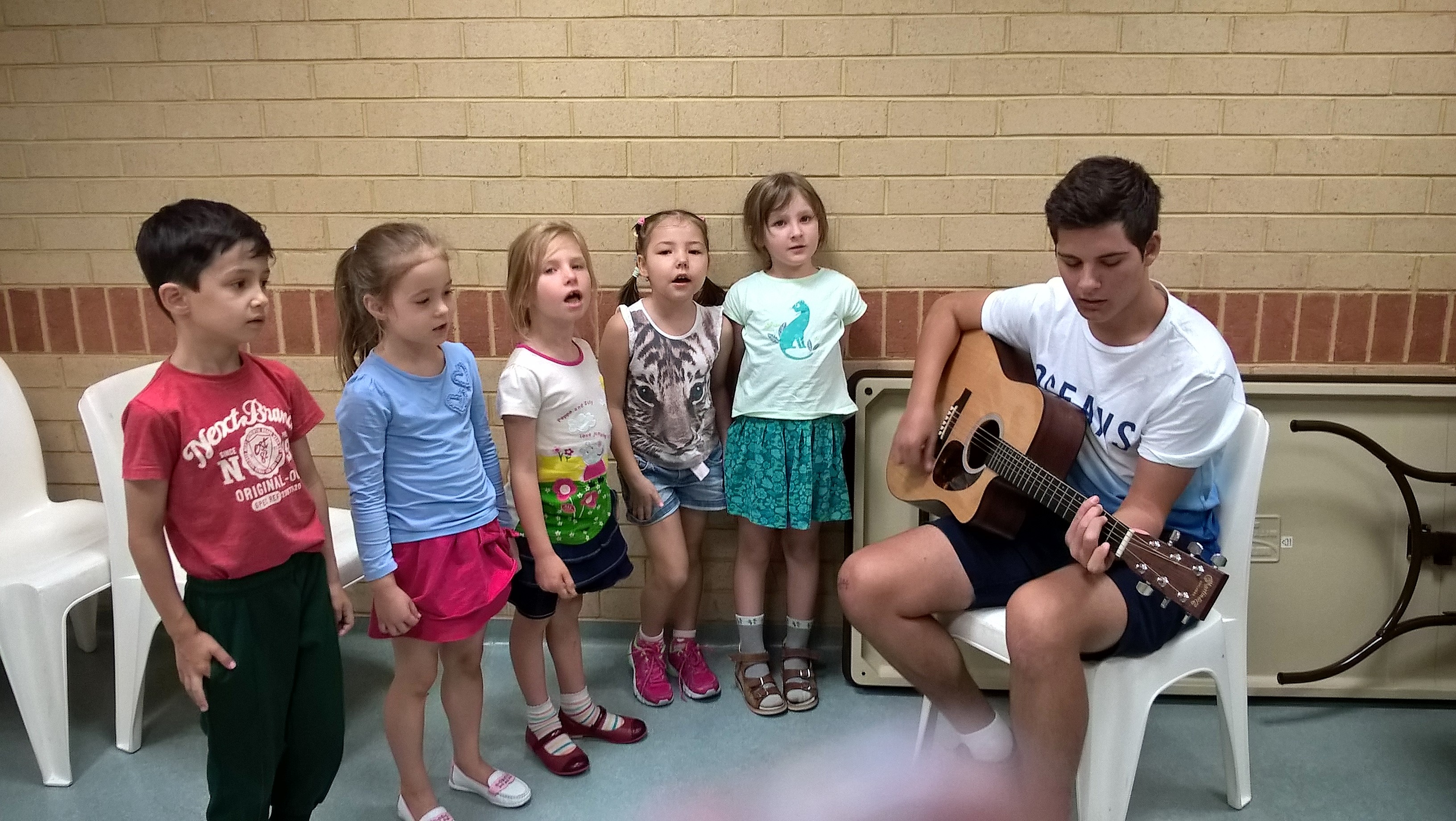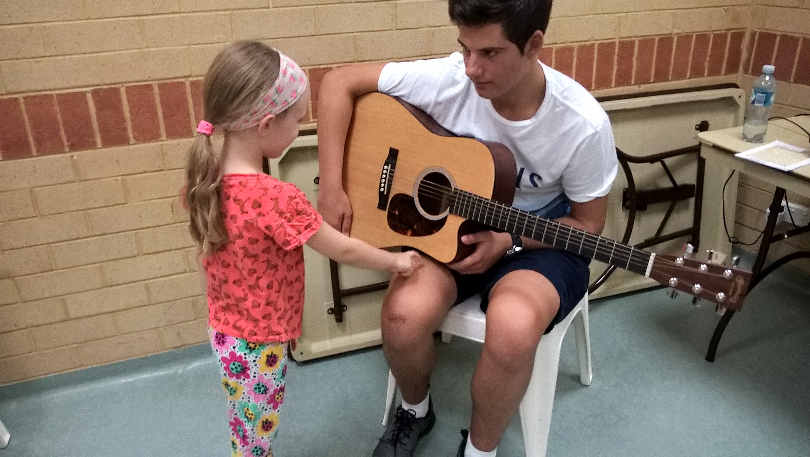 На наши уроки пришел ученик нашей школы Жученко Федя, который учится играть на гитаре. Ребята увидели в классе, что на гитаре играют пальцами, но можно и медиатором. Они смогли подержать гитару в руках и попробовали извлекать из нее звуки. Федя поиграл ребятам небольшие пьесы, а потом мы все вместе попели детские песенки под гитарный аккомпанемент.