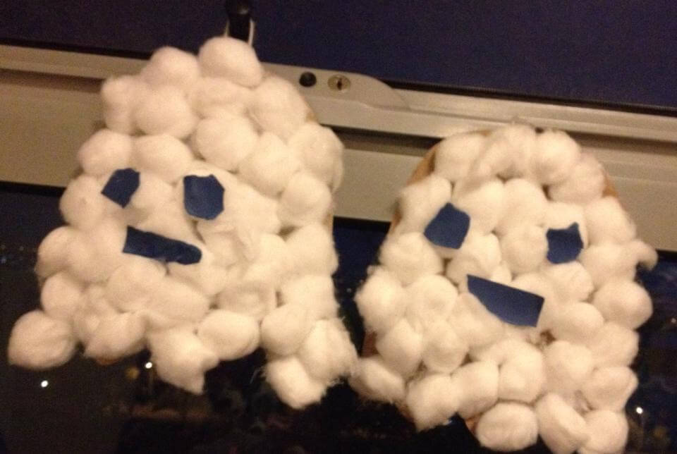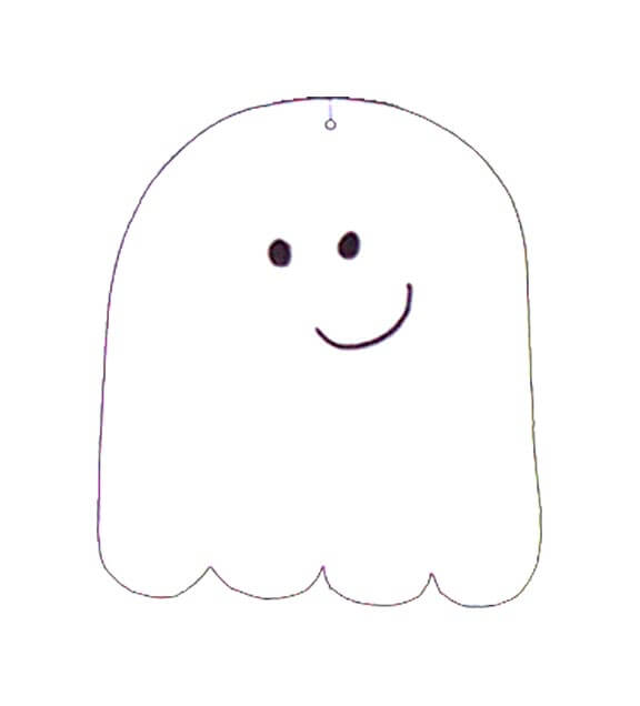 На плотной бумаге или картоне нарисовать привидение подобное как на фото, вырезать. Наклеить на привидение ватные шарики. Из цветной бумаги вырезать глаза и рот. Приклеить веревочку и развесить привидения по дому.