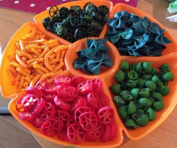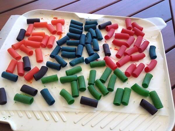 Процедура очень проста: покупаем макароны разных размеров и форм, особенно разнообразны итальянские ( например, на рынках или я нашла большой выбор в Skytti , что на Angelo street в South Perth). Кладем макароны в пластиковый контейнер, я нашла, что результат окраски в контейнерах получается лучше, чем в пластиковом пакете.