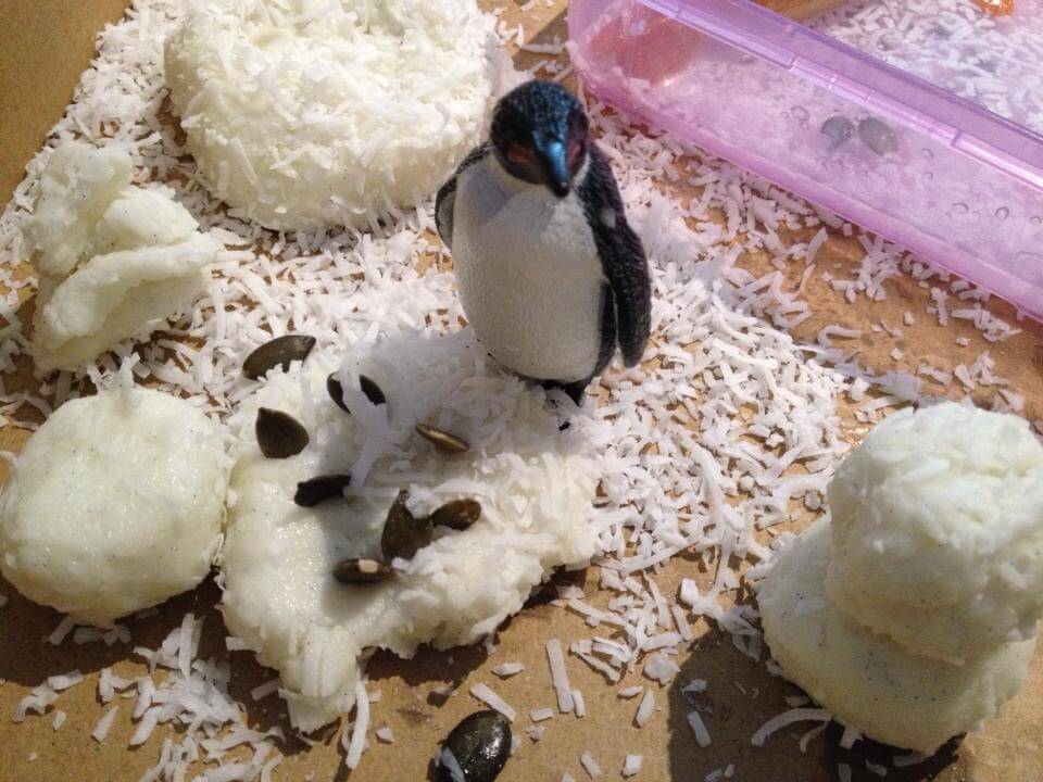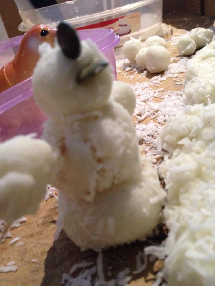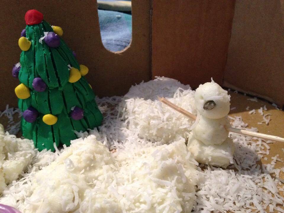 Вот такое тесто мы используем, чтобы лепить снеговиков. По ощущениям отличается от обычного теста, но на снег не похож. Белые хлопья это desiccated coconut.