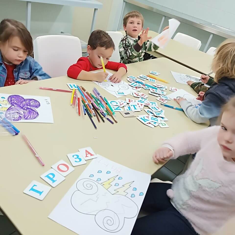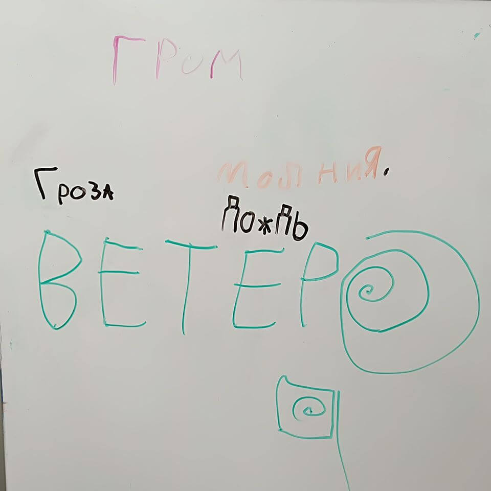 Новости из наших подготовительных групп. В этой четверти в оранжевых группах мы изучаем природные явления. На прошлом занятия ребята познакомились с таким явлением, как гроза. Мы обсудили, что такое гроза, что бывает во время грозы, как возникает гроза и как себя вести во время грозы. Ребята с большим удовольствием писали слова на доске и разукрашивали рисунок на тему грозы.