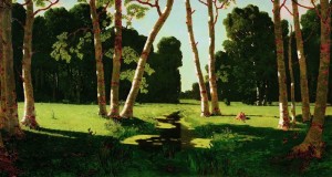 1879 год. В картине сохранен прием среза верхнего края изображения, как в фотокадре, придавшего виду некий частный характер. В картине Березовая роща Куинджи расширяет плоскость неба и разрежает планы, в связи с чем меняется интерпретация пейзажа, устремленная к передаче светлого и радостного состояния природы.